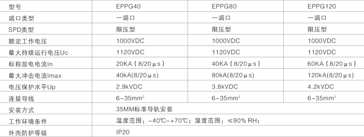EPPG系列直流光伏电源浪涌保护器是由多个单片式限压单元组成,广泛应用于光伏直流1000V发电系统中,对太阳能电池板,汇流箱、直流配电柜及光伏逆变器等系统配套设备进行雷电感应浪涌防护,能有效防止由雷电感应波和线路浪涌冲击所造成的设备损坏,最大程度的保证了光伏发电系统的稳定性和可靠性,保护光伏系统稳定可靠地运行。 EPPG系列电源避雷器接线简便,安装方便,安全可靠。具有漏电流小,反应快。保护能力强,可满足高可靠高稳定系统的要求。 【技术参数】 ![]() 【产品安装示意图】